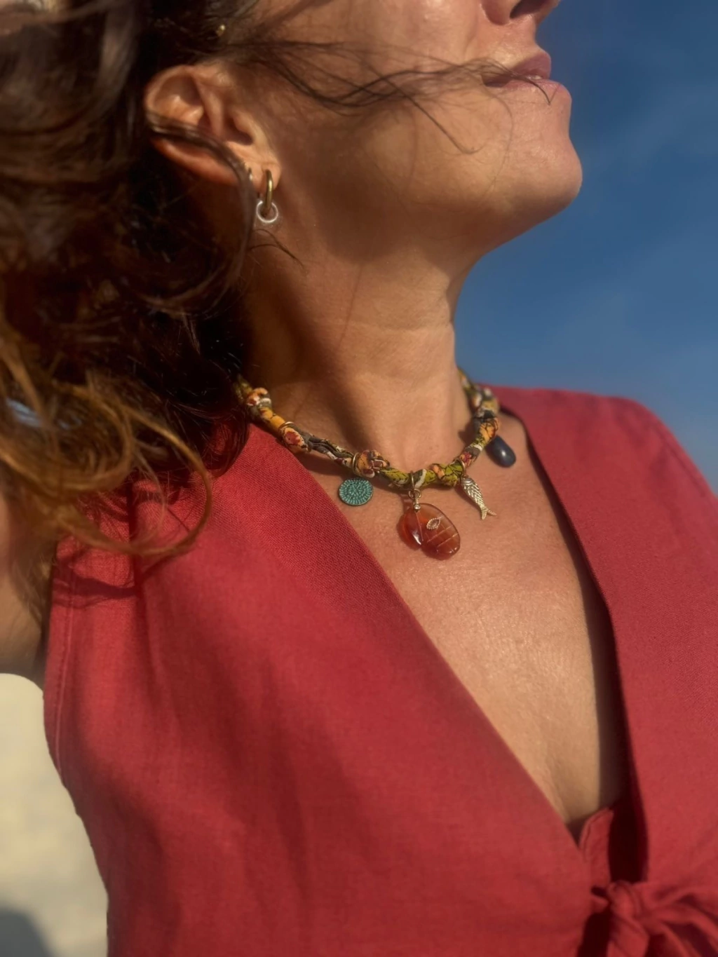 2- HAMSA MARRÓN: mano hamsa de agata cornalina u ojo de tigre, piedra de cuarzo dálmata, gota de cuarzo azul y dijes de metal en forma de pez y círculo.
